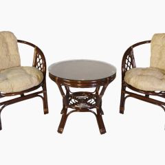 Комплект из натурального ротанга, состоящий из двух кресел и круглого столика с плетеной столешницей. Стекло входит в комплект.